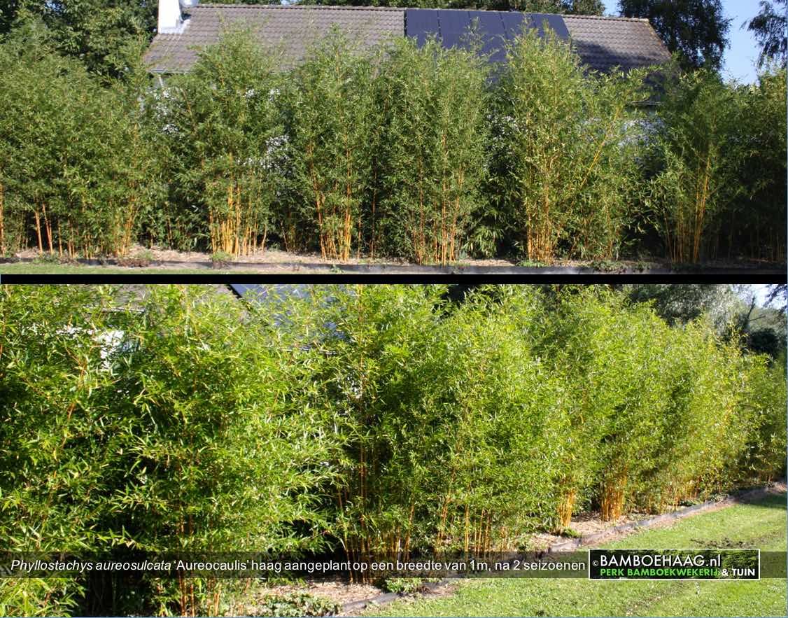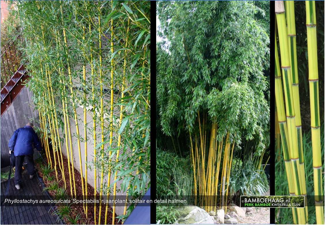 en de cultivars 'Aureocaulis' (gouden bamboe) en 'Spectabilis' (Kimmei bamboe) hebben respectievelijk een diepgele en geelgroene gestreepte halm. Voor vrijgroeiende heggen tot 5 tot 8 meter is Phyllostachys aureosulcata een uitstekende keuze. Deze soortgroep heeft een stevig opgaande groei, goede windbestendigheid en zeer goed winterhard. De volgende vormen zijn interessant: