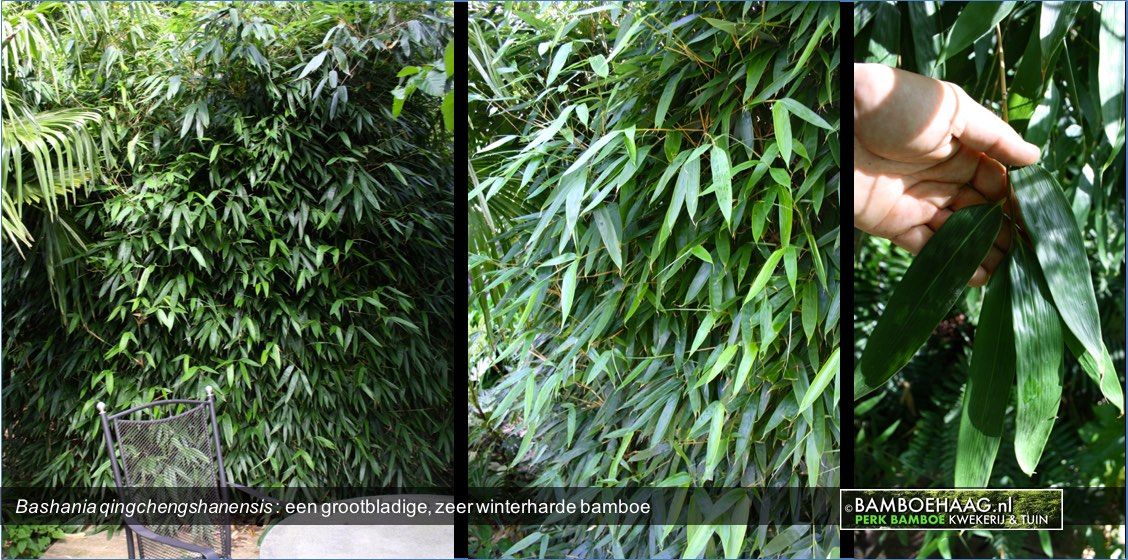 is een grootbladige, compact groeiende, zeer sterke wintergroene bamboe. Na strenge vorst is het een van de beste soorten. Opvallend zijn de glanzende grote donkergroene bladeren en harige schutbladen en knopen. Bashina qingshengshanensis groeit 3 tot 5 m hoog. Hij kan worden gesnoeid tot een gewenste hoogte. Het is een van de eerste soorten die in de lente veel nieuwe halmen produceert. Het is een veel sterker en mooier alternatief voor de veelgebruikte Pseudosasa japonica. Het is nog wel een relatief zeldzame soort, daarom verkrijgbaar in kleine aantallen. Als u veel planten nodig heeft, plaats dan uw bestelling vroeg in het seizoen, zodat we tijd hebben om planten op te kweken.
