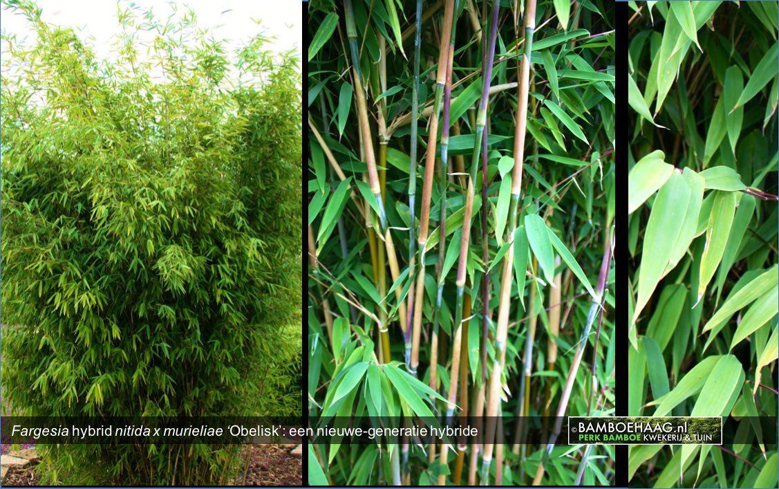 Fargesia 'Obelisk' (nitida 'Nymphenburg' x 'Eisenach' x murieliae) is een waardevolle zaailing uit 2007. Deze bamboe groeit krachtig, tamelijk rechtop en compact. De oranjebruine halmen contrasteren mooi met de diepgroene bladeren. De verwachte uiteindelijke hoogte is 3 tot 4 meter.