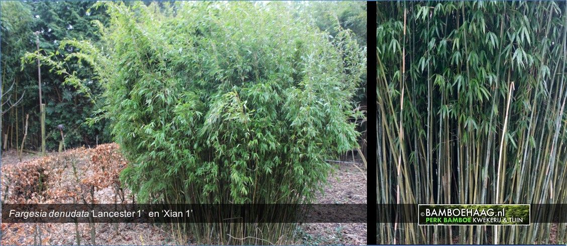 Fargesia denudata is een 2-3 m, winterharde soort met relatief kleine, lichtgroene bladeren en halmen die aanvankelijk blauwachtig zijn en later olijfgroen worden. De groene halmen hebben de neiging om voorover te buigen en een fonteinvormige groeihabitus te creëren. Deze plant kan ook worden gesnoeid om de hoogte te verminderen en overhangende halmen weg te nemen. Fargesias denudata heeft geen sterke bladval in de herfst, zodat de plant mooi groen blijft gedurende de winter. Er zijn meerdere klonen in omloop. Door Roy Lancester zijn twee vormen geïntroduceerd uit Sichuan; Fargesia denudata 'Lancester 1' en 'Lancester 2'. Er is nog een import geweest vanuit Xian, verspreid onder de naam ‘Xian 1’ en ‘Xian 2’ .In de showtuin vind je een solitaire plant van 'Lancester 1' en een plant van 'Xian 1' die meer opgaand groeit. Voor de verkoop kunnen er planten van 'Lancester 1' beschikbaar zijn.